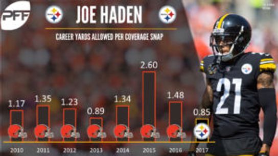 Haden was very good last year, though many still thought he was worse than ever before. On the contrary, according to PFF, Joe Haden was allowing the least yards per coverage snap in his career. In many aspects, especially with the surrounding defensive help, he's playing better than back when he was considered a top 3 corner. Though he has been injury prone in the past, missing 5 games is not a deal breaker. In addition, while he was on the field he was a game changer and held a weak safety core from falling to pieces.