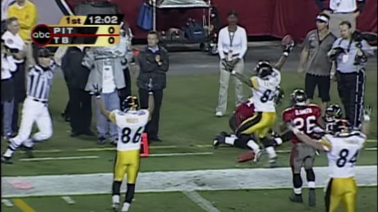 Pittsburgh would win the toss and elect to receive. Quarterback Tommy Maddox would get to work from the Steelers own 19-yard line. On the very first play of the game, Maddox would find Plaxico Burress for 41 yards and the Steelers were in business. A few Bettis runs, and another reception by Burress put the Steelers at the Bucs 11-yard line. On the next play, Maddox would find Antwaan Randle El for an 11-yard touchdown and it was 7-0 Steelers.