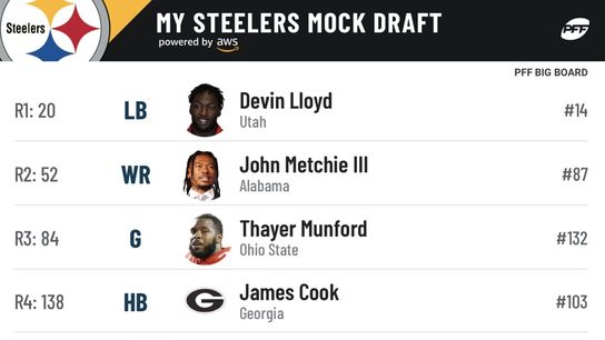 Mike wrote: "New linebackers coach Brian Flores gets a new toy with Devin Lloyd in Round 1. Lloyd has the chance to be the perfect duo with Devin Bush as Lloyd has the size (6’3” 235lbs) to make up for what Bush lacks but also has the athleticism to match. He may not have Bush’s speed but he is a good enough athlete to be an improvement over their current prospects. Lloyd can serve as a great safety net to be their athletic linebacker in case Bush has a repeat performance of 2021. John Metchie III in the second seems more like a luxury since he may not return in time for the season to start. Tearing his ACL in December, Metchie III will be unable to show off his talents in pre-draft workouts but that could be the true silver lining because that may be the exact reason he could drop to the Steelers in Round 2. He is a polished route runner and a true vertical threat that the Steelers will need well beyond 2022. Thayer Munford is a perfect choice for the Steelers as he brings positional flexibility to the offensive line playing both guard and tackle extensively. A 3 year starter at left tackle, Munford elected to slide inside to guard for 2021 so the team could but their best 5 lineman on the field. While tackle seems to be his more natural and better position, he has shown the capability to play both. Munford very well could be the type of player fighting for a starting position. The rest of the draft is rounded out with depth, the highlight being James Cook, Dalvin Cook’s younger brother. Cook would bring a dynamic skill set similar to Anthony McFarland’s but hopefully he could translate it to on the field results."