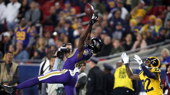 LOS ANGELES, CALIFORNIA - NOVEMBER 25: Miles Boykin #80 of the Baltimore Ravens makes a reception over the defense of Troy Hill #22 of the Los Angeles Rams during the second half of a game at Los Angeles Memorial Coliseum on November 25, 2019, in Los Angeles, California. (Photo by Sean M. Haffey/Getty Images)