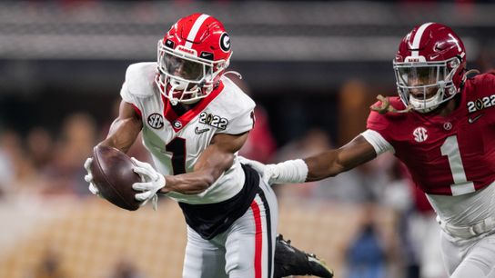 INDIANAPOLIS, IN - JANUARY 10: Georgia Bulldogs WR George Pickens (1) catches a deep pass against Alabama Crimson Tide DB Kool-Aid McKinstry (1) during the Alabama Crimson Tide versus the Georgia Bulldogs in the College Football Playoff National Championship, on January 10, 2022, at Lucas Oil Stadium in Indianapolis, IN. (Photo by Zach Bolinger/Icon Sportswire via Getty Images)