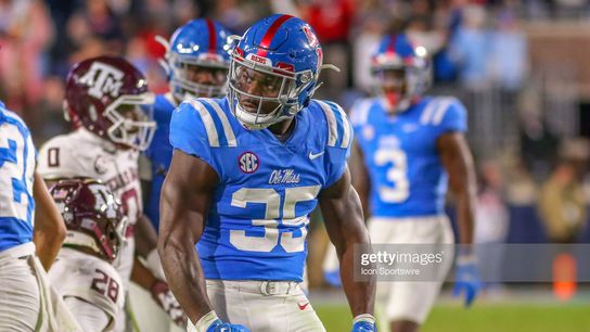 OXFORD, MS - NOVEMBER 13: Ole Miss Rebels linebacker Mark Robinson (35) flexes after making a tackle during the game between the Ole Miss Rebels and the Texas A&M Aggies on November 13, 2021, at Vaught-Hemingway Stadiumin Oxford, Ms. (Photo by Chris McDill/Icon Sportswire via Getty Images)