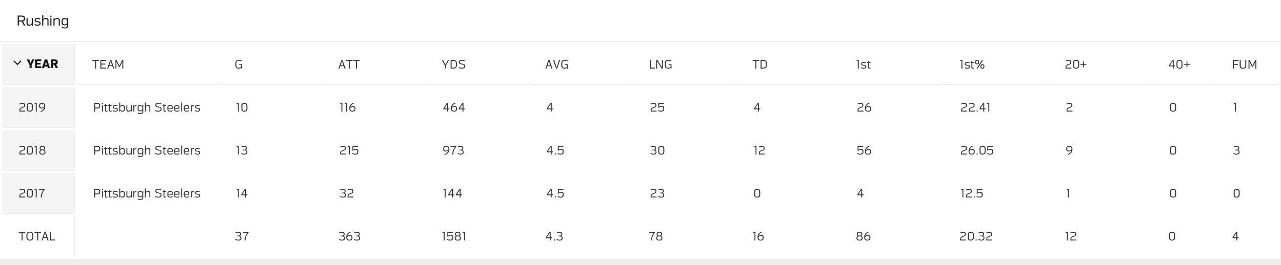 Like Ben Roethlisberger, Conner is also coming off a 2019 season riddled with injuries. He played in only 10 games and rushed for 464 yards and four touchdowns after rushing for almost 1,000 yards and 12 touchdowns in 2018.