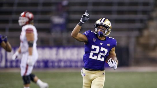 Nov 28, 2020; Seattle, Washington, USA; Washington Huskies defensive back Trent McDuffie (22) celebrates following an interception against the Utah Utes during the fourth quarter at Alaska Airlines Field at Husky Stadium. Mandatory Credit: Joe Nicholson-USA TODAY Sports