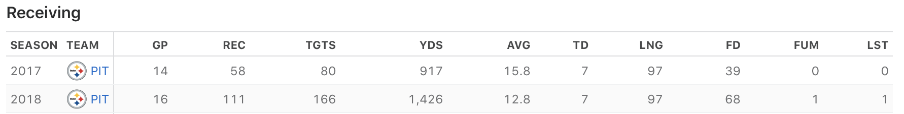 Smith-Schuster made a noticeable impact on the field in his rookie season in 2017 with 58 receptions for 917 yards and 7 touchdowns (that 97-yarder really stood out). But the real splash came in this sophomore season where he caught the ball a whopping 111 times on 166 targets, racking up 1,426 receiving yards and 7 touchdowns (and yet another 97-yard long).