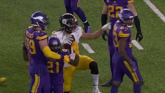 Standing strong in the pocket and being hit immediately after the throw, Roethlisberger threaded a pass between 3 Vikings with perfect precision and touch to Freiermuth. The rookie TE had the ball in both hands and had it almost secured before Vikings safety Harrison Smith got just enough of a hand in to prevent Freiermuth from completing the catch.